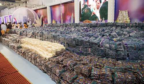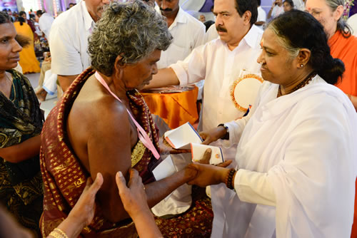 Fattiga människor behöver få nya kläder då och då för att behålla sin värdighet och livskvalitet. Med detta i åtanke kungjorde Amma en gåva av 150 000 nya saris till mottagarna av våra livslånga pensioner och mödrar till våra skolstipendiater. Representanter från byarna hämtade saris direkt från Amma hand och tog dem tillbaka till sina byar för distribution.