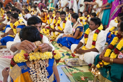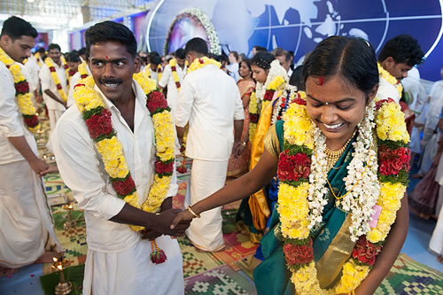 I Indien är ett traditionellt bröllop ett av de viktigaste ögonblicken i en människas liv, inte bara för paret men även för hela familjen. Att inte kunna betala för ett traditionellt bröllop kan vara en förnedrande upplevelse för människor som lever i fattigdom. I årtionden har det varit en årlig tradition för Amma att genomföra bröllop för par som inte har råd med en traditionell ceremoni. I år sponsrades 63 par med brudklänning, guldsmycken, en bröllopsfest för deras vänner och familj och alla andra händelser i samband med bröllopet. Amma prydde personligen varje brud och ledde ceremonin.