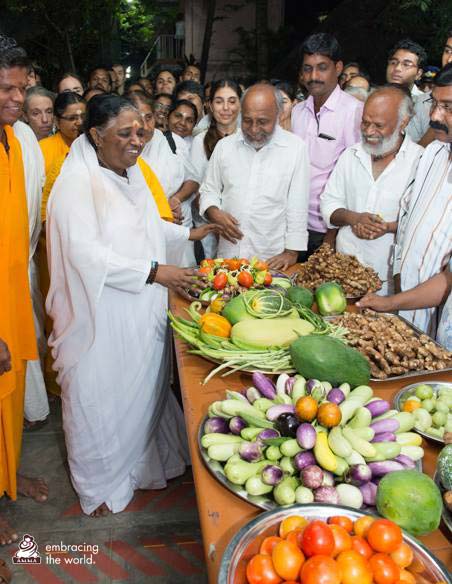 Amma serverar lunch till alla invånare i vårt huvudkontor varje tisdag, och det senaste året har den varit 100% ekologisk. Måltiden innehåller nya grödor av okra, tomater, pumpor, bönor, chili, röd spenat, aubergine, kål och lök - alla omsorgsfullt odlade utan bekämpningsmedel. "Amma uppmanade oss att återinföra den gamla ekologiska jordbrukskultur", säger Br. Gurudas ansvarig för projektet. "I Amritapuri började vi odla ekologiska livsmedel för Amma tisdagsmåltider."