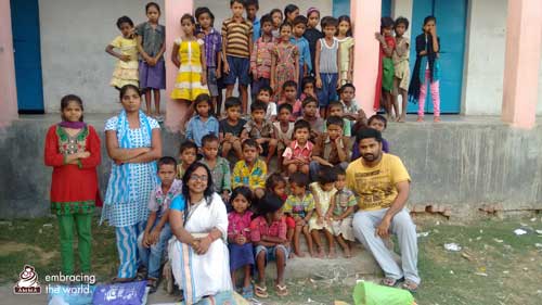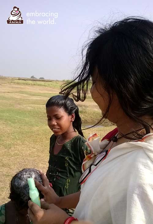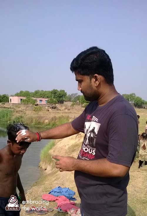 Som svar på denna allvarliga situation skickade Amma ett team från Amrita Universitys ”AMMACHI Labs” för att leverera praktisk hjälp och hållbara lösningar till Mushar folkets koloni. Trots höga sommartemperaturer tillbringade våra volontärer en månad i Bihar, där de bodde i närheten av bosättningen för att bygga kontakter och förstå problemområdena. A AMMACHI Labs genomförde utbildning i grundläggande färdigheter och grundläggande kunskaper om sanitet som en del av deras världsomfattande kampanj "Women Empowerment Sanitation" (Kvinnor, Bemyndigande, Sanitet). En dag tog laget spontant några barn ner till floden för att lära dem vikten av bad och hygien. Till en början kom bara sex barn, men när de väl nådde floden deltog 25 glada barn i det roliga, engagerande och effektfulla tilldragelsen. Barnen försågs med handdukar, tvål, schampo läkemedel och olja och undervisades i det korrekta sättet att använda den. Det finns nu flera planer på att fortsätta undervisningen i hygien och toalett konstruktion i regionen.