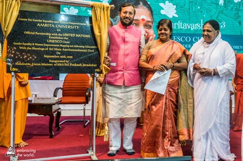 Prakash Javadekar, Indiens minister för utveckling av mänskliga resurser, meddelade förra veckan etableringen av en UNESCO-professur för jämställdhet och kvinnors egenmakt. Professuren valdes att inrättas på vårt eget Amrita University, Amritapuri och kommer att fokusera på att kartlägga kvinnors utsatthet. Detta görs för att få en helhetssyn som kan användas för att utforma lämpliga lösningar.
